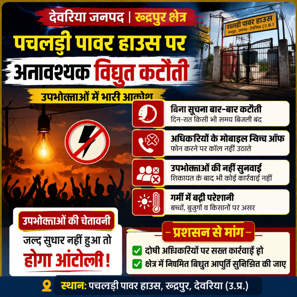 देवरिया जनपद के रुद्रपुर क्षेत्र अंतर्गत पचलड़ी पावर हाउस की लापरवाही और अनियमित विद्युत आपूर्ति को लेकर उपभोक्ताओं में भारी आक्रोश देखने को मिल रहा है। क्षेत्र में लगातार हो रही अनावश्यक बिजली कटौती ने आम जनजीवन को पूरी तरह प्रभावित कर दिया है।