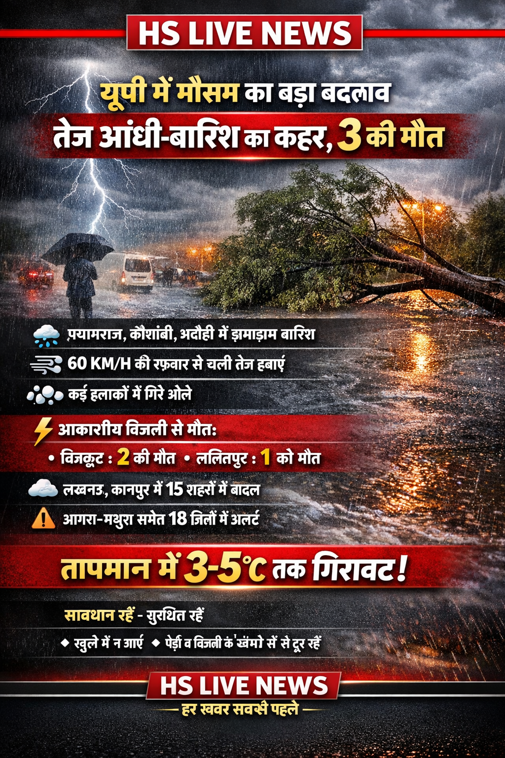 🌧️ यूपी में बदला मौसम: तेज आंधी-बारिश, बिजली गिरने से 3 की मौत, कई जिलों में अलर्ट